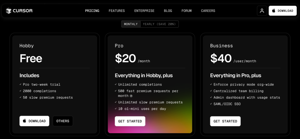 Cursor предлагает три тарифных плана, адаптированных под различные потребности разработчиков: